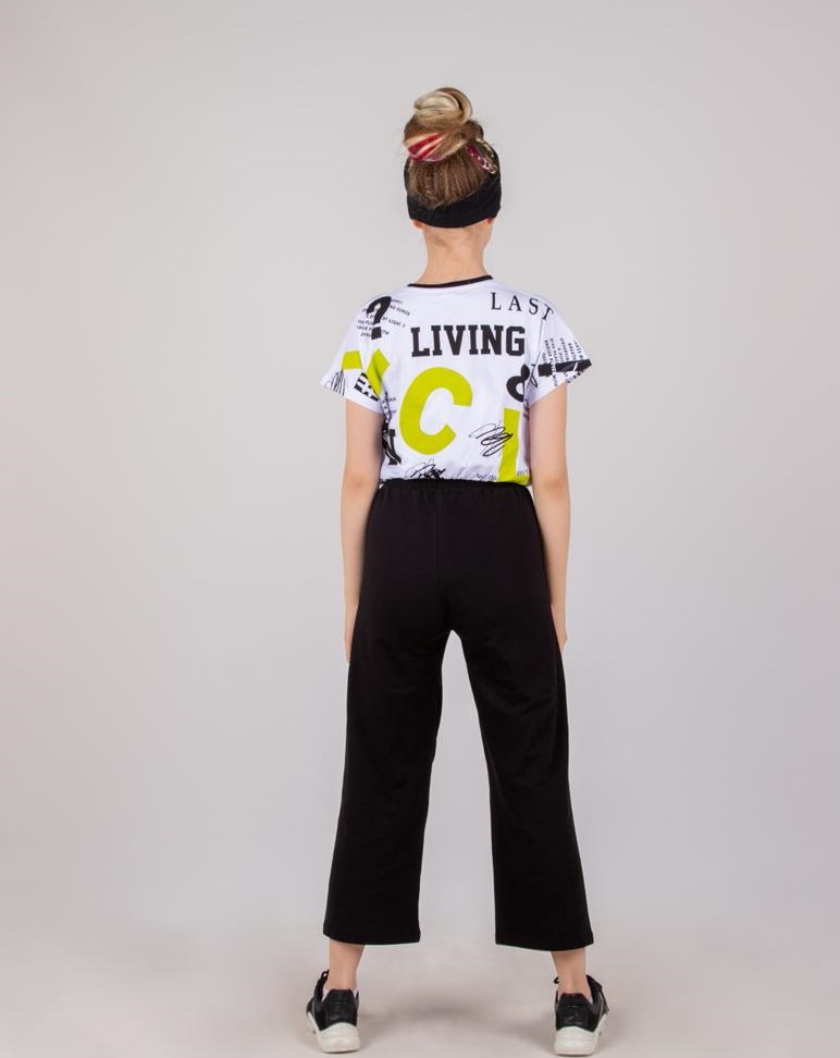 Комфортный костюм для девочек на каждый день. Модель выполнена из трикотажа (кулирка) и состоит из укороченных брюк свободного кроя, на эластичном поясе со шнурком, а так же футболки со спущенной линией плеча и ярким принтом.