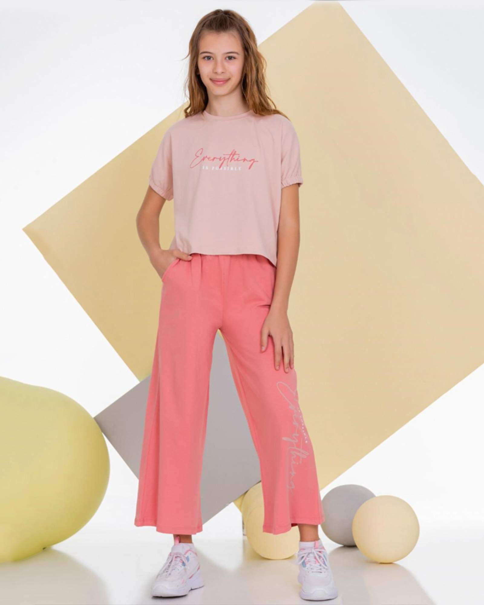 Стильный костюм Smile для девочки оптом. Укороченная футболка свободного кроя оформлена принтом. Рукава присборены резинкой. Широкие брюки с боковыми карманами и защипами на поясе создают модный образ. Костюм Smile для девочки оптом, выполнен из трикотажа кулирка.