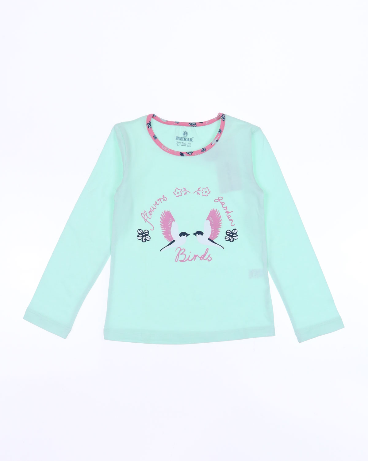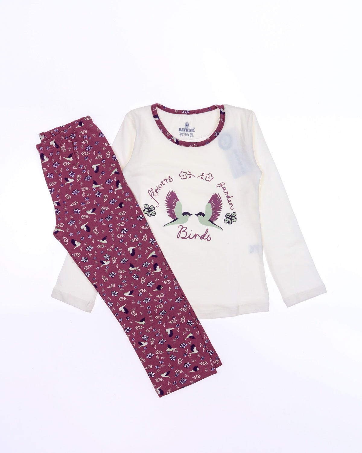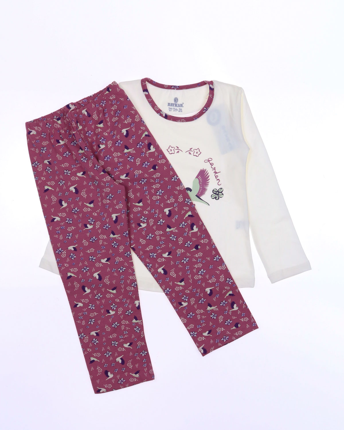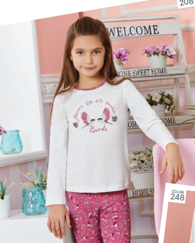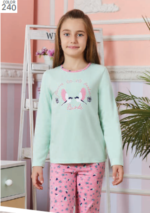 Пижама BAYKAR для девочки оптом с длинными рукавами и прямыми брюками без манжетов. Поверхность пижамки не закатается и не покроется пилями, благодаря высокому качеству хлопка. Небольшое добавление эластана не позволит изделию сесть и не даст вытянуться.